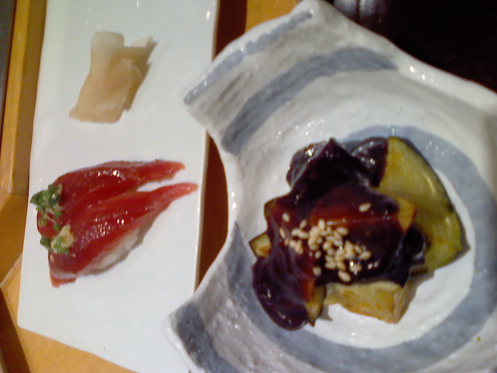 写真は、私達のためにハートの盛り付けをしてくれたハラスの巻物で、いつも注文します。ハラスをカリカリに焼いてくれて、超おいしいです。なすの田楽は甘くておいしかったです。
