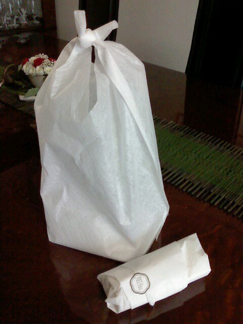 その時のラッピングが写真のように、不織布で風呂敷風に包んでました。おまんじゅうは、数が少なかったせいか、紙で直接つつんでありました。ちょっとかわってて、いい感じでした。
