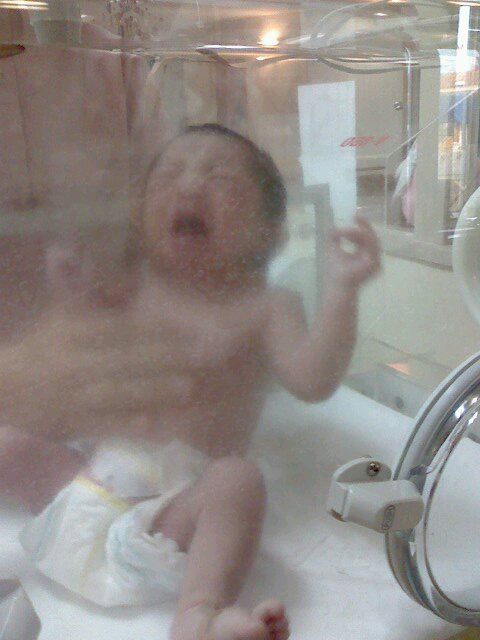 ゆうがた、甥に子供が生まれ、妹と病院にかけつけたところ、保育器の中に、寝かされてました。看護婦さんがわざわざ写真とりやすいよう、おこしてくれました。