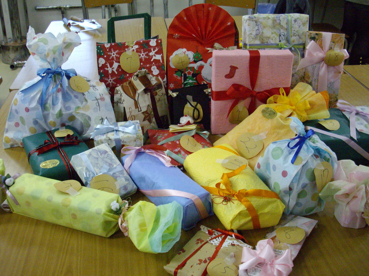 みんな、思い思いのラッピングをして、くじを引いて、あたった物を、ラッピングした人が、まずラッピングの説明をして、