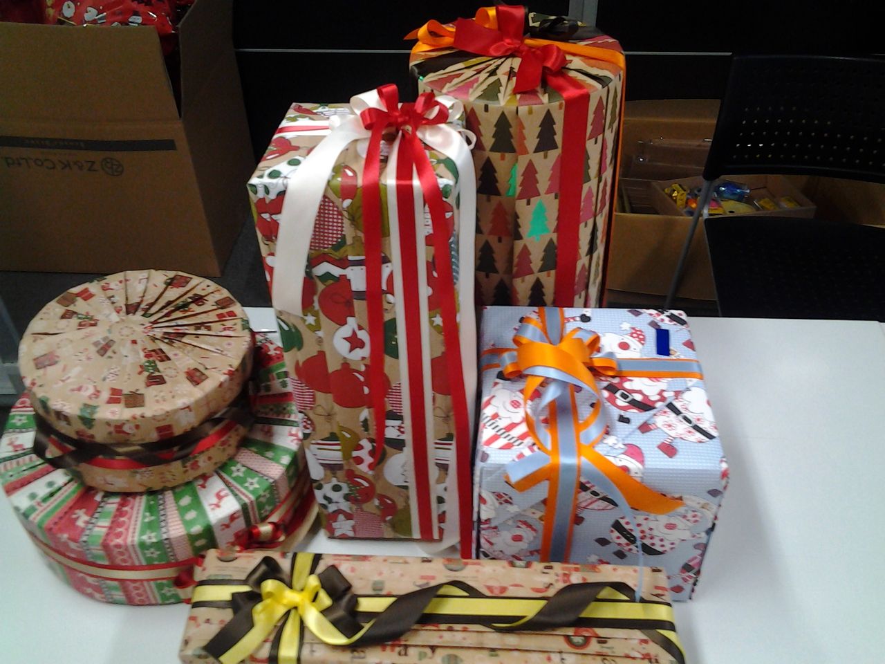 1枚では包めないので紙をついで、発泡スチロールでできた円柱や立方体の箱やら抱え込んでのラッピングです。