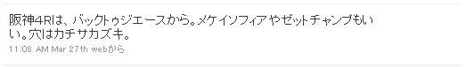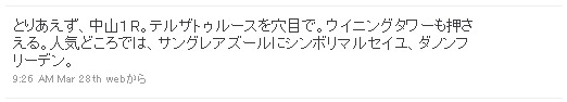 そして、阪神1R。ここは少し狙ってみたい馬が浮上してきました。というわけで、以下のように投稿しました。