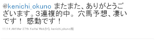 しかし、大穴としてあげておいたノーフォークパインが3着に入線。なんとか形は付けたでしょうか。この後、こちらの投稿に対して返信がありました。