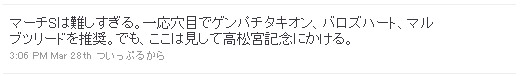 中山メインのマーチSは、難解すぎて狙いを絞りきれなかったのですが、一応穴として面白そうな馬がいましたので、3頭だけ挙げさせてもらいました。