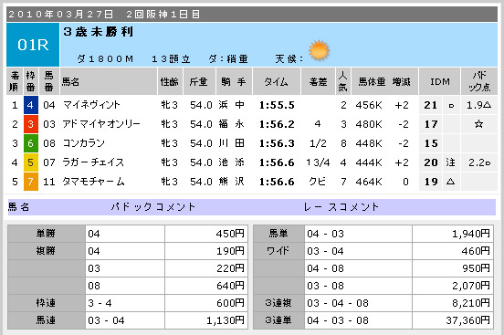 要するに、指数と各種情報の一致するところが極めて少なかったからなんです。大抵、推奨できる馬というのは、私が今開発中の適性指数とIDMがうまく絡み合っていたり、他の情報指数が後押ししてくれたりと、ある種のパターンにより浮上してくるものなのですが、この日はそういうパターンをほとんど見いだすことができませんでした。