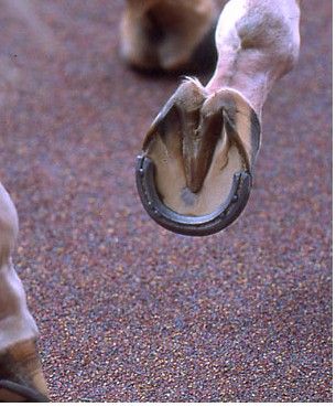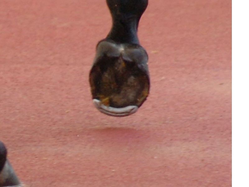 通常の兼用鉄との見分け方は、蹄を横や後ろから見た時に、「蹄のきわの部分」と、「鉄尾」の位置が離れているかどうか。鉄尾が蹄の半分のところに位置していれば、半鉄を履いていると見分けることができる。