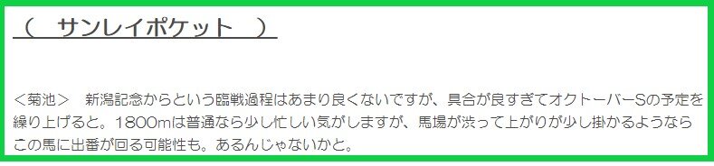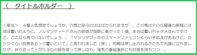 菊池 関西に雨予報があるので何かの弾みで降ったりしないかいくらか心配はありますが、高確率で晴れ・良馬場での開催でしょうね。