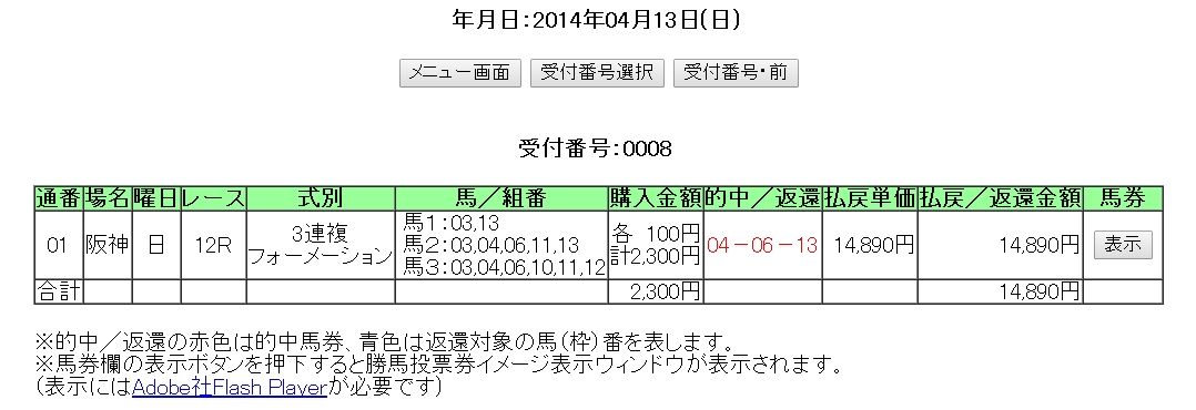 的中報告です!奥野さんが桜花賞のIDMについて語ってたのでそれに乗っかった三連単。それと最終Rのお祭りです。三連複BOXにしてたら外れてました(汗