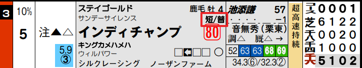 こうしたゴール前までの要素を含めた上がりの指数が、ストライド競馬新聞に掲載されている後半3ハロン想定値となります。