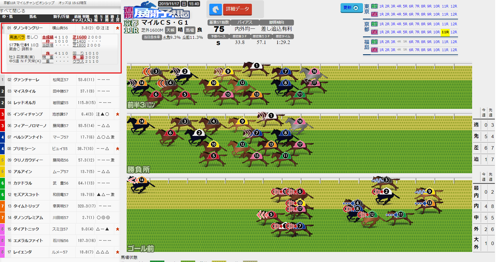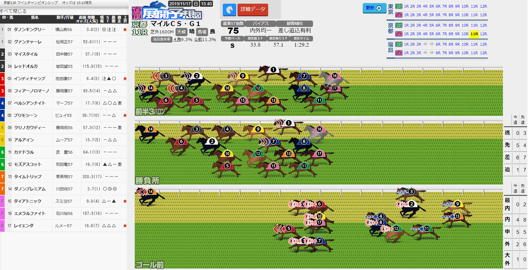 直前展開予想は直前のパドック、オッズ、状態、馬体、気配、馬具変更、脚元の疾患、トラックバイアスなどの当日の生きた情報を加味して計算しています。