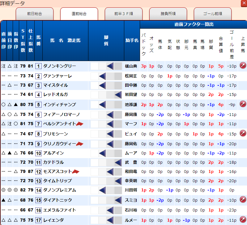 前日総合タブでは前日の展開予想データが、ゴール前順などはそれぞれの順番でソートされたものが表示されます。