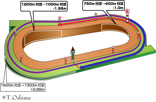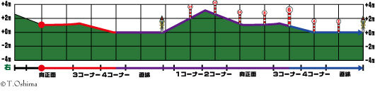 1スタート直後は平坦だが3コーナーから下り坂になる。