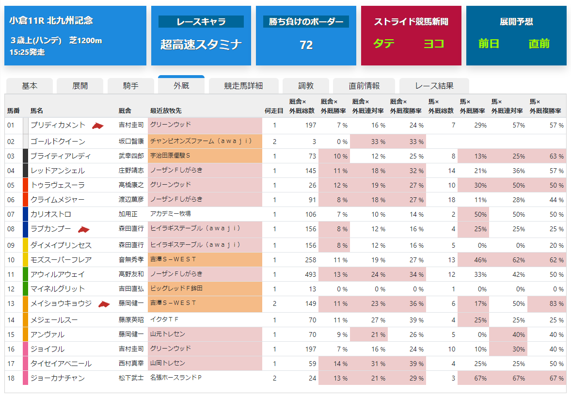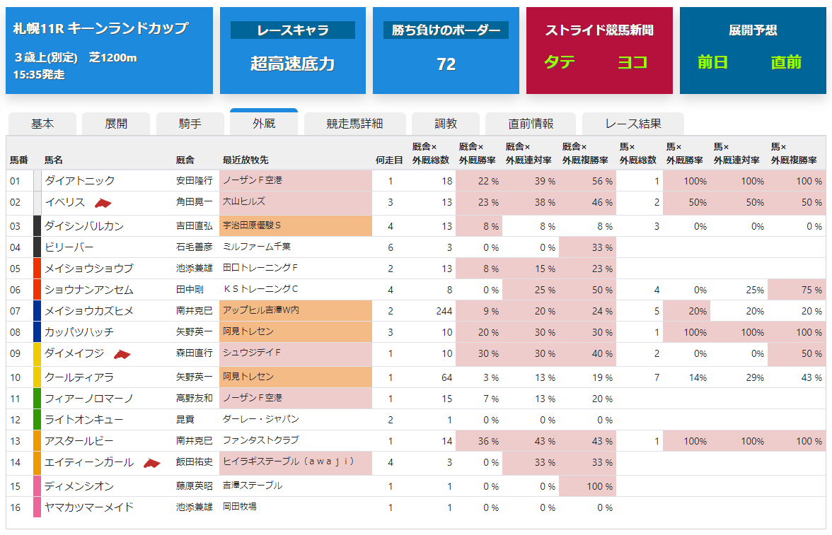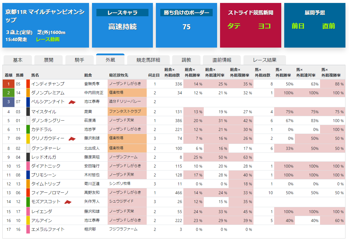 追走力などのストライドアビリティや各馬の出遅れ率、展開予想図の順位とその差などが閲覧できます。