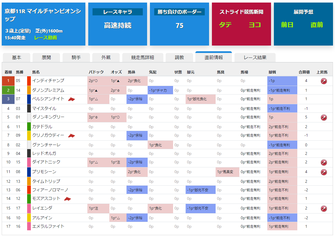 直前情報は直前展開予想画面でも確認できますが、こちらはより直前情報に特化しています。