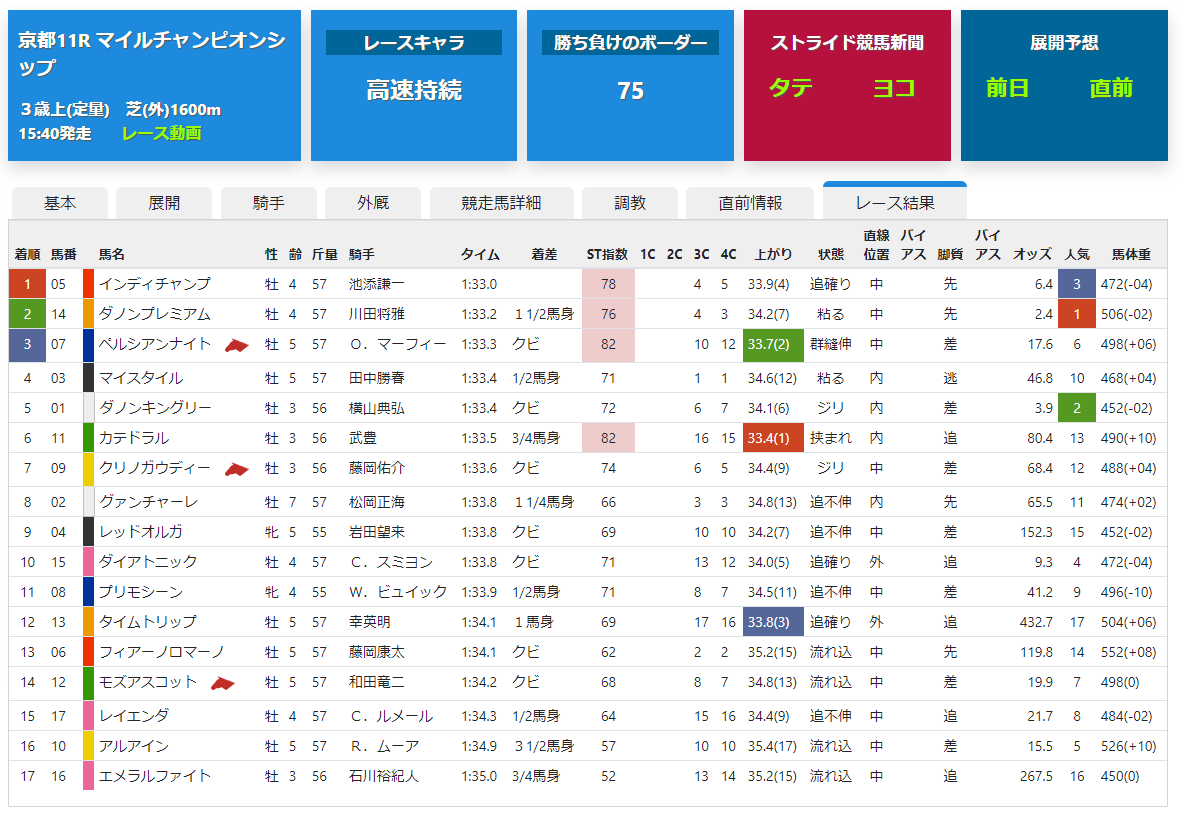 開催日には通過順などの表記に留まりますが、翌週の木曜日15時半頃には確定後の当該レースの成績版ストライド指数やトラックバイアスの有利不利などが反映されます。