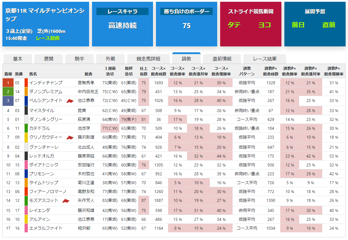 仕上指数は競走馬のデキを調教内容、厩舎評価、外厩から算出しているストライド競馬新聞サイトオリジナルの指数です。