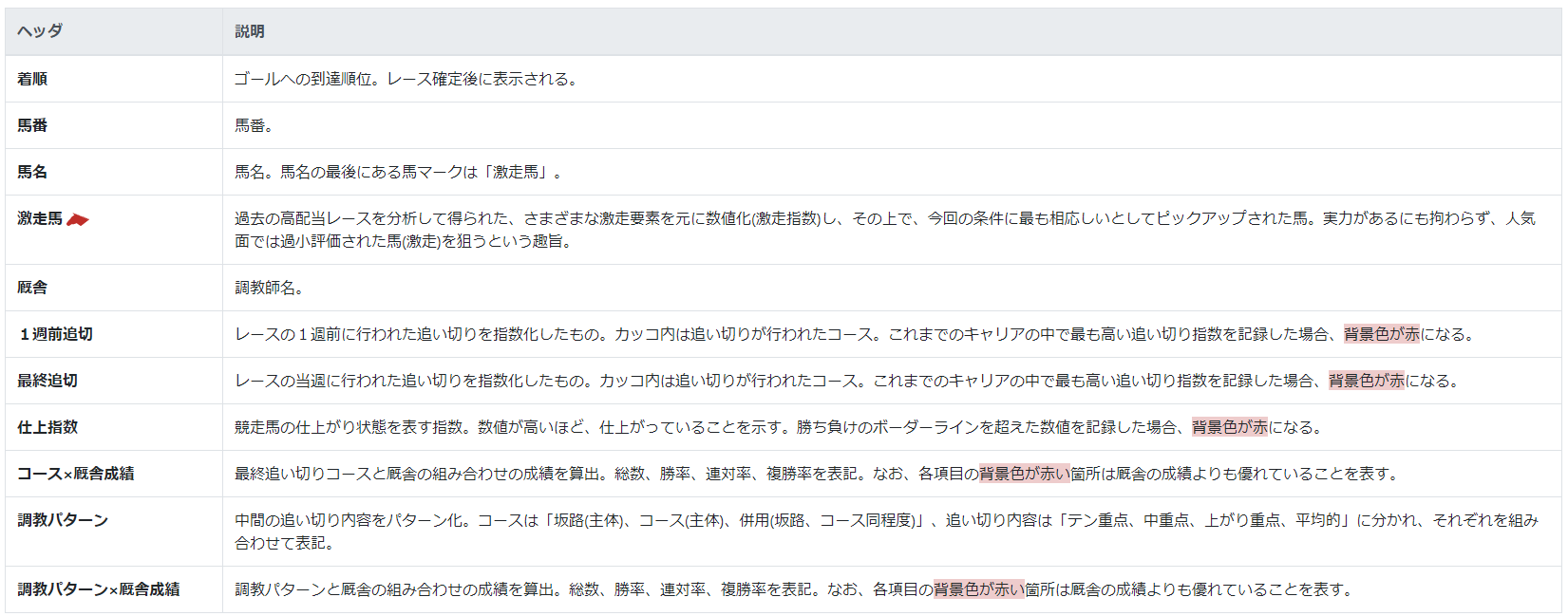 それぞれ場毎にこれまでの追い切りの中で最も高い指数を記録した場合は、背景色が赤に変わります。
