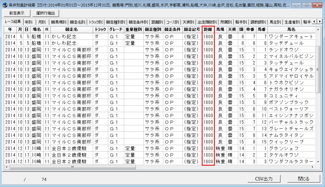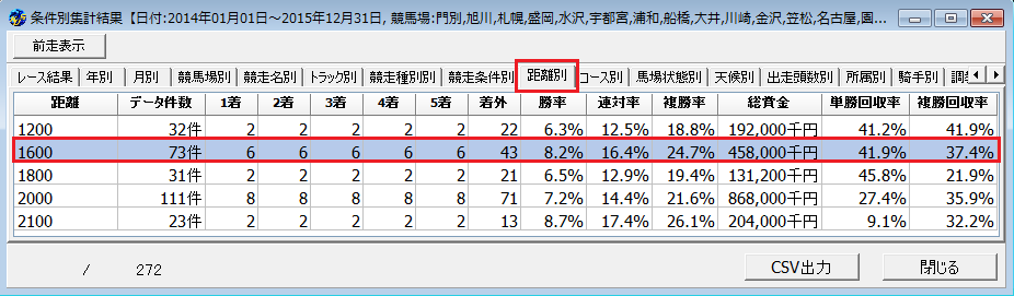 ここから1600m戦のみを抽出する場合は、「距離別」タブを選択し、1600mの欄をダブルクリックします。