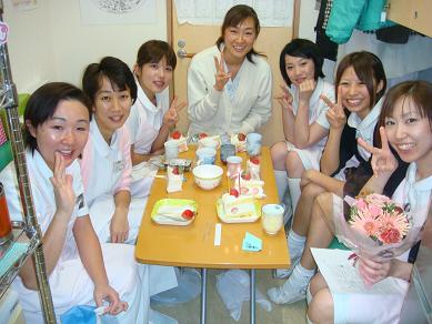 写真はいつものようにギュウギュウのスタッフルームで(笑)、イチゴのショートケーキをみんなで食べながら、きれいな花束を片手に記念撮影をしました。
