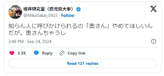 先日、鹿児島大学准教授で日本語学を研究する坂井美日さんが「だが日本語には、独身30代女性への呼びかけ名詞が無いのだよな」と投稿。