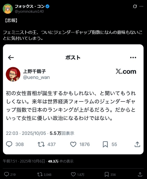 今後はジェンダーギャップとか言い出したらこの件上げればいいな