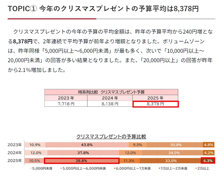 おもちゃメーカーのバンダイの調査によると、子どものクリスマスプレゼントにかける平均予算額は8,378円で、2年連続で増えました。特に「2万円以上」の予算を組む家庭も増え、物価高の影響や、子どもが欲しがる商品の価格上昇が背景にあるようです。