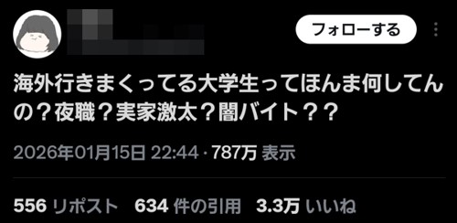 【謎】SNS女性「海外行きまくってる大学生って何してんの?夜職?実家激太?」 大学生「頭の構造が違う」