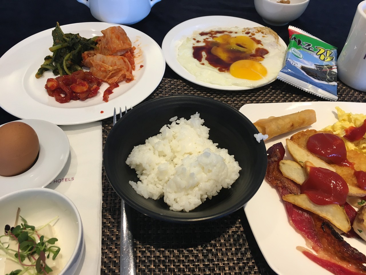 ソウルのホテルの朝食ビュッフェには、白いご飯、味噌汁、納豆、豆腐、キムチ等があり、日本人の口にはベストマッチですな!