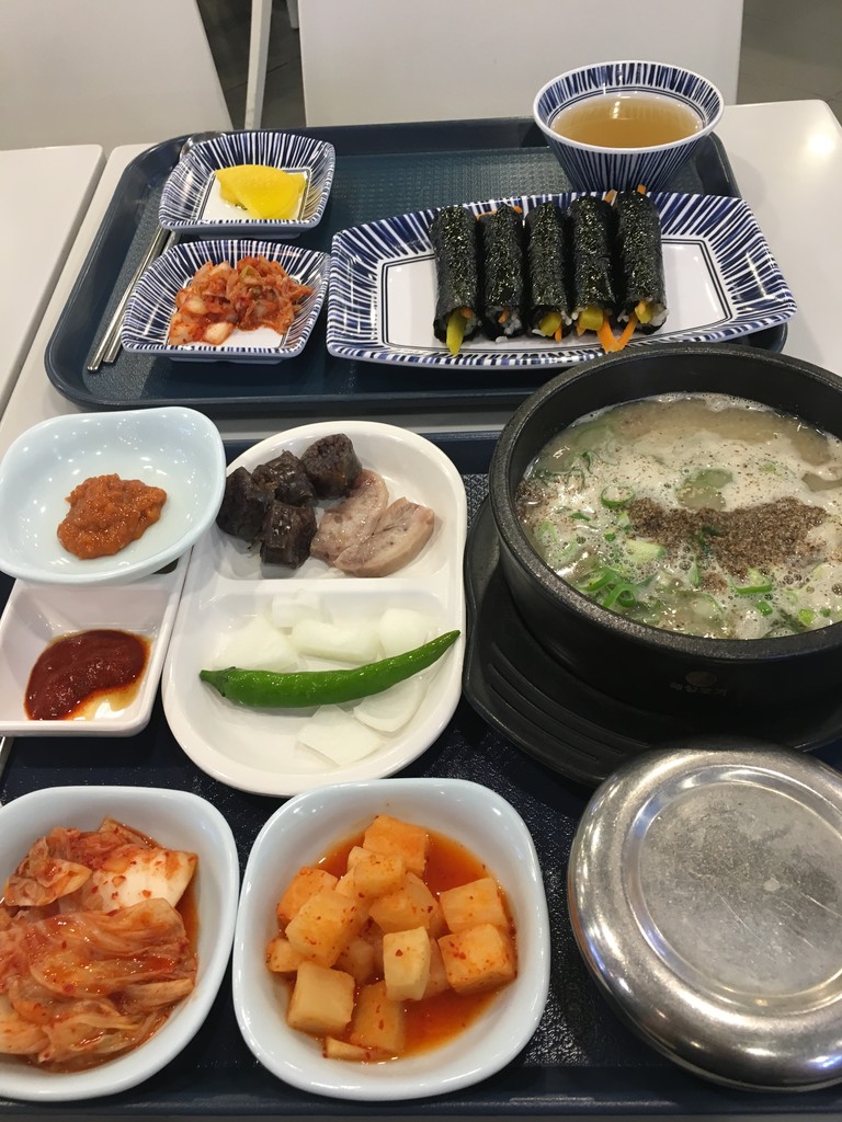 ソウル駅のフードコートで、スンデグ(豚の腸詰スープ)とキンパ(海苔巻き)を食べました。