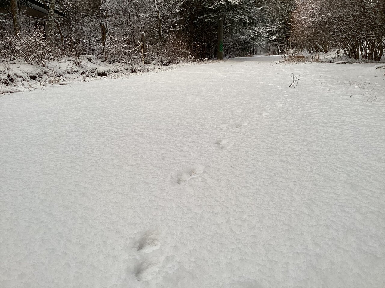 こちらには別の動物の足跡。足のサイズも歩き方も全然違う。雪の日動物の足跡で種類を特定できたら楽しいだろうな。ぽんきちが判別できるのはこれくらいかな?
