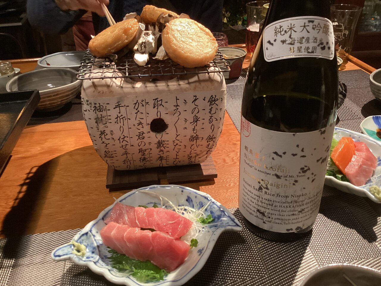 クリスマスイブから降り始めた雨は夜更け過ぎになっても雪に変わらなかった。なんだか拍子抜けの雨のクリスマスだ。東京から友人が来て2泊。イブイブは和風のディナー。納戸に仕舞ったまま忘れていた飛騨こんろを久々に出してみた。お土産の八海山酒造が北海道の酒造好適米「彗星」で醸した純米大吟醸で一杯、二杯、三杯、、、。