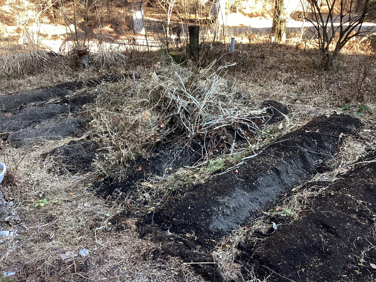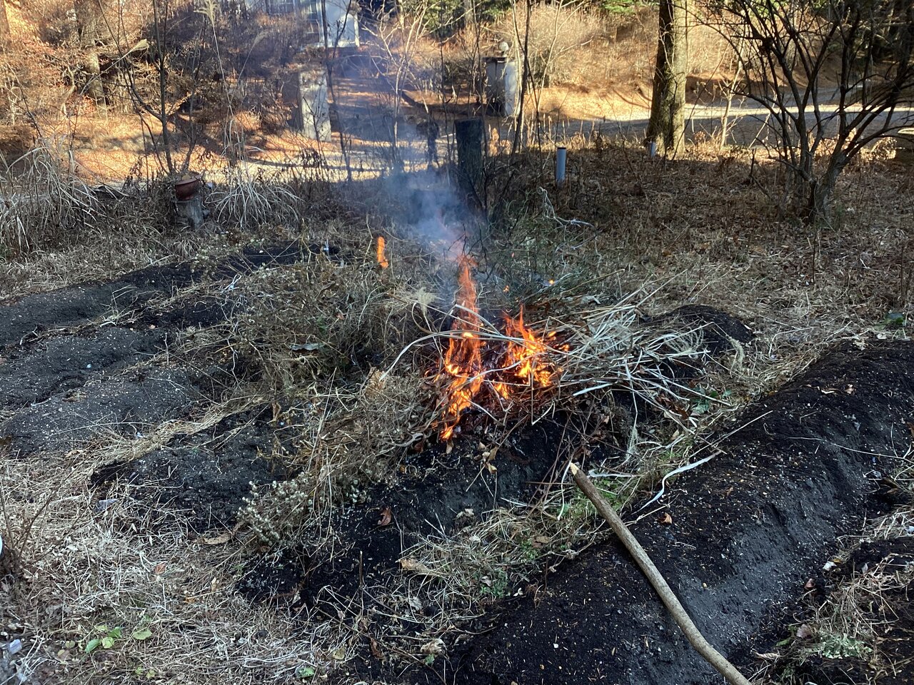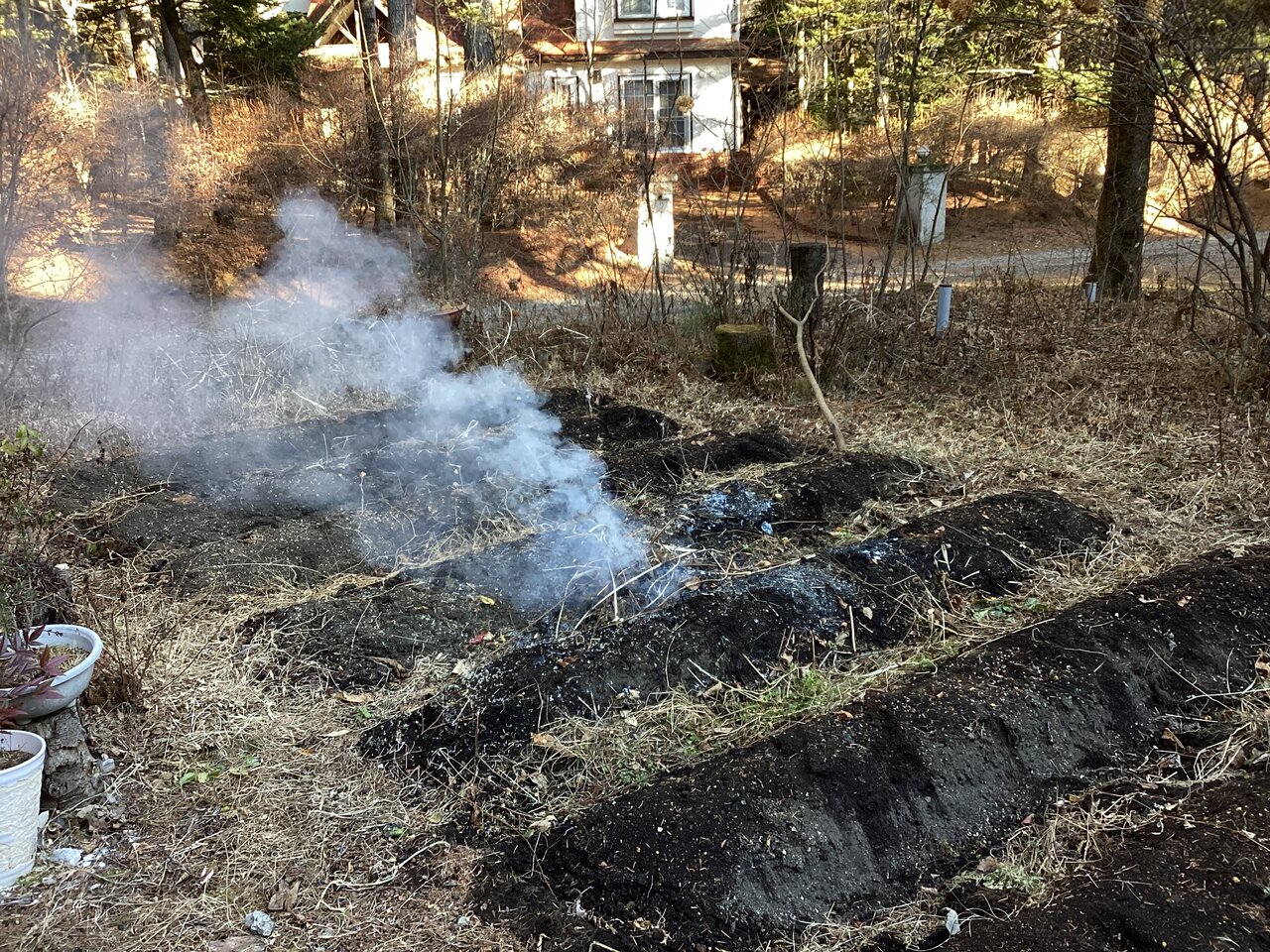 万が一のことがあるので燃えかすに水をかけておく。本来なら収穫が終わるまでに雑草を取り除き、堆肥や落ち葉と消石灰を入れてよく耕しおくべきなのだが、もう時すでに遅し。今年はこのままで年を越すことになりそうだ。
