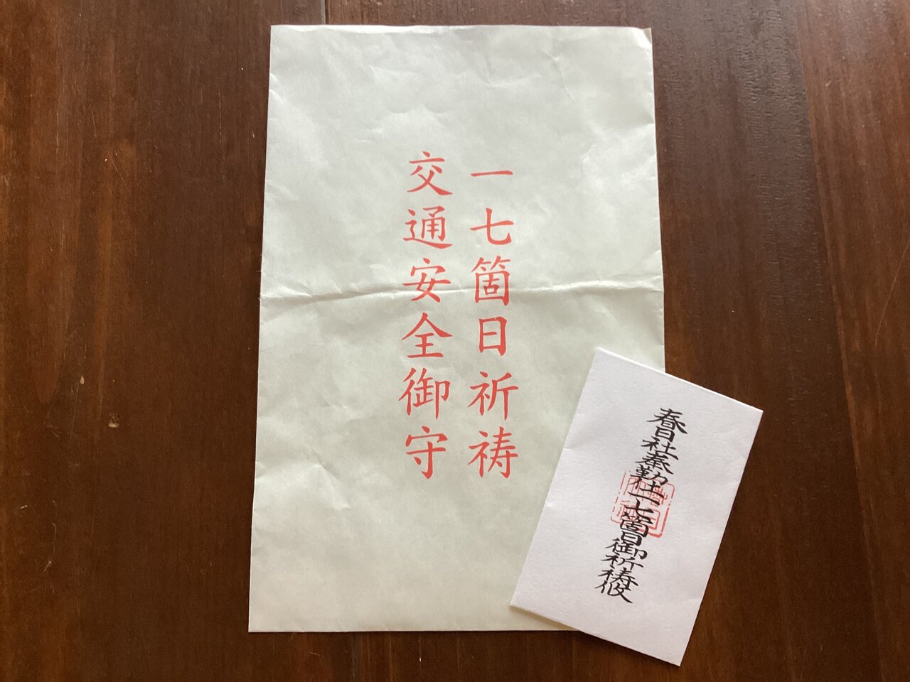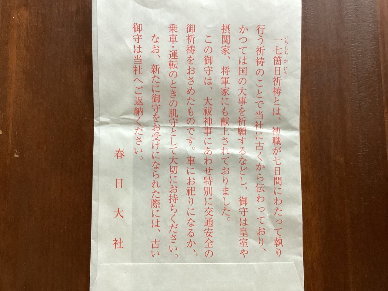 後日このような十七箇日祈祷交通安全御守が返送されてくる。春日大社で我々が送った身代わりの形代を17日間に渡ってお祈りしたありがたい御守である。