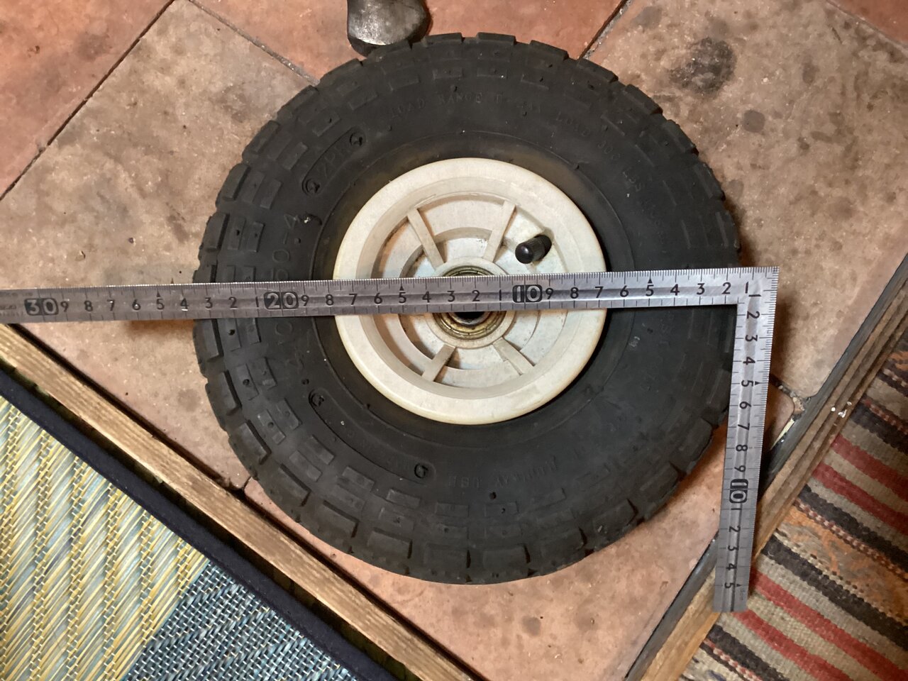 タイヤを外してホームセンターで同じものを買おうとしたがカインズ、コメリ、D2、農家の店大地まで行って探してみたがどこにも売っていない。サイズは24cm=8インチ。それならネットでと思ったが、これが全く見つからない。8インチタイヤは大抵は子供用バイク、車椅子、一輪車用なのだが、同じサイズで同じトレッド径15ミリのものは見つからない。 8インチのタイヤはあるにはあるが芯の直径が違ったり仕様が違ったりで使い物にならなそう。