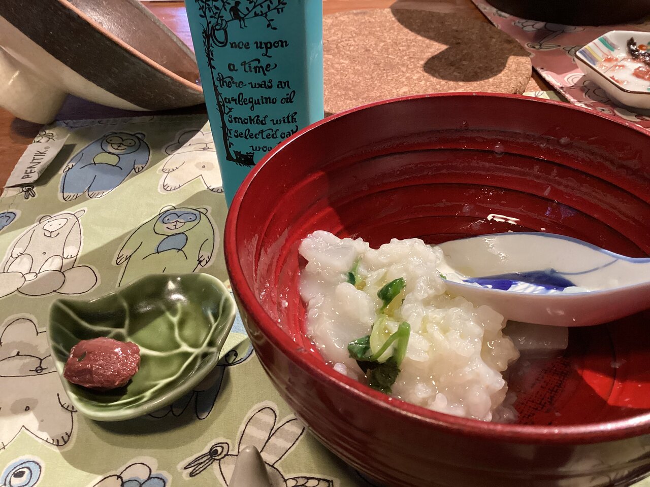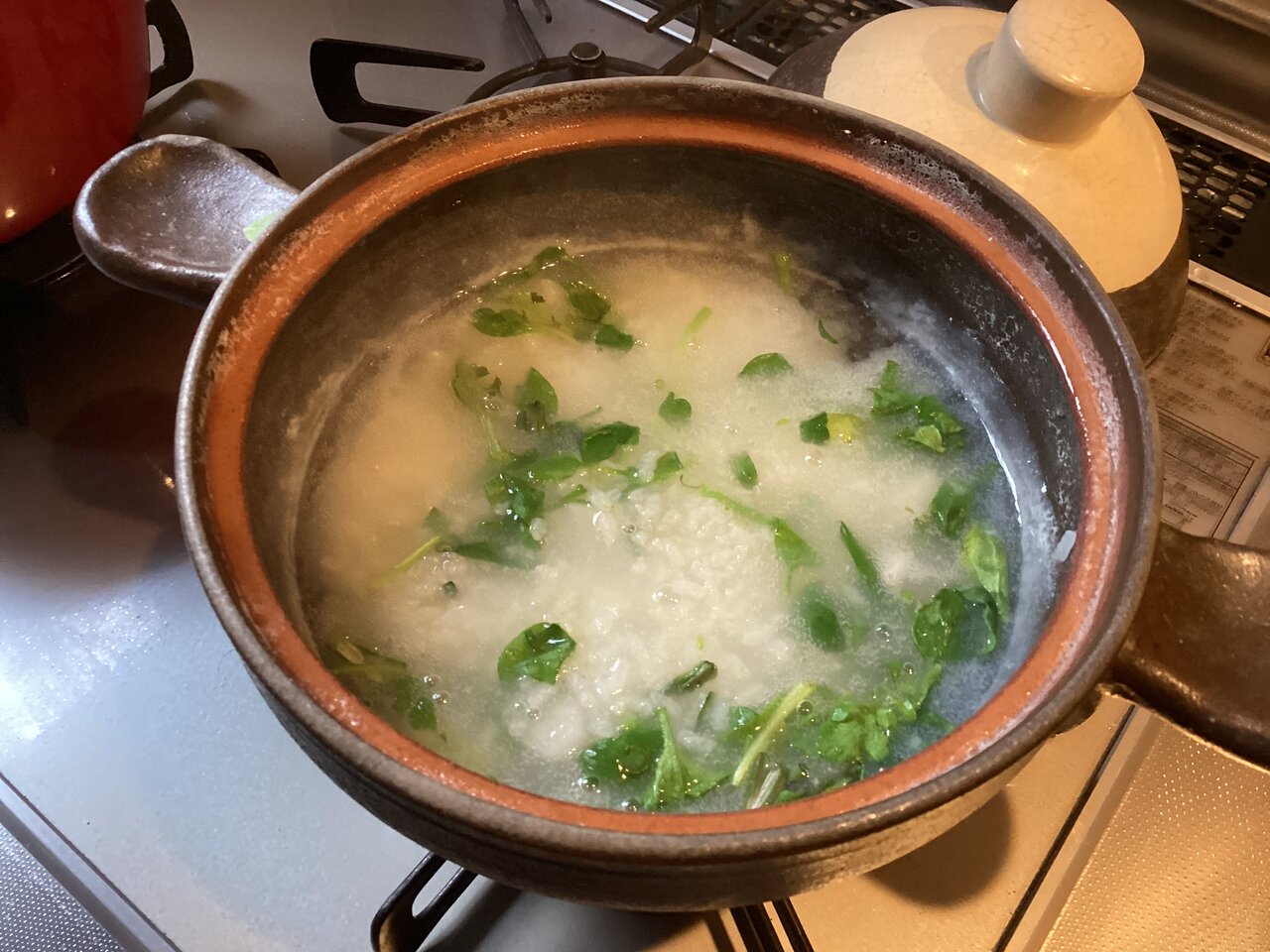 数年前に買ったお気に入りの土鍋で米を煮る。米は1合弱、水は600ccほど、塩ひとつまみ。スズナ(カブ)とスズシロ(大根)は米と一緒に水から煮る。ネットのレシピには調味料は塩のみと書かれていることが多いが、ほんの少しだけ昆布を入れると美味しくなる。本当は油揚げ(油条)、豚肉(鶏肉)、胡麻油、溶き卵など加えて中華風のお粥にすればもっと美味しくなるのだろうが、これでは意味がわからなくなってしまうので我慢。