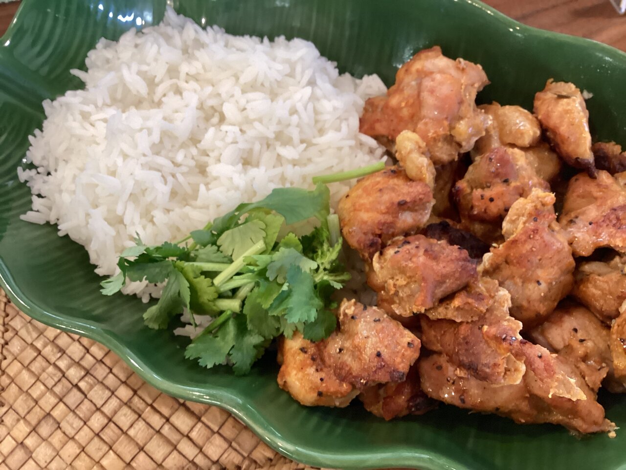 本日のスペシャリティはマサラチキンとジャスミンライス。本格マサラスパイスとヨーグルトでマリネードした鶏肉に最高級の香り米を付けました。今年最初で最後の登場です。