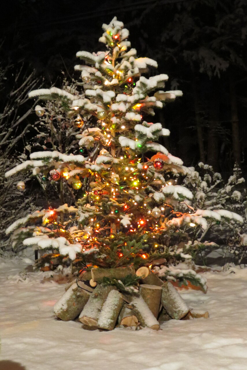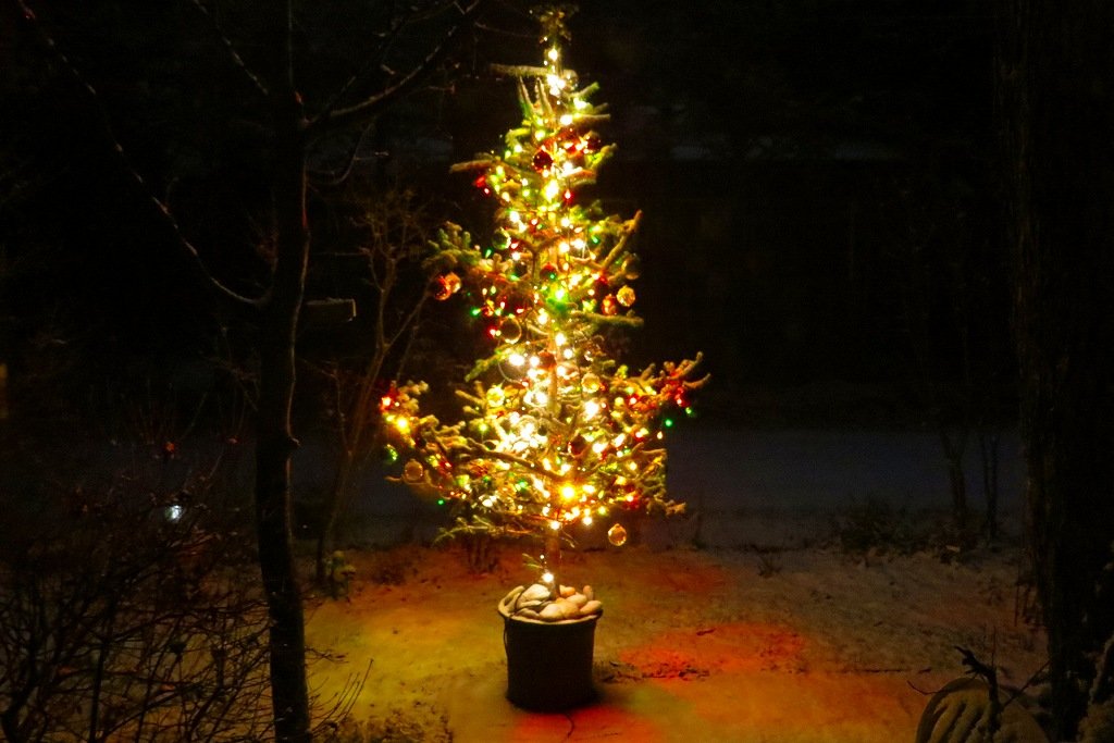 10年ほど前の庭のクリスマスツリー。この頃生木のモミを庭に立ててイルミネーションを施すことがブームだった。折下雪のクリスマス。究極の自己満足?
