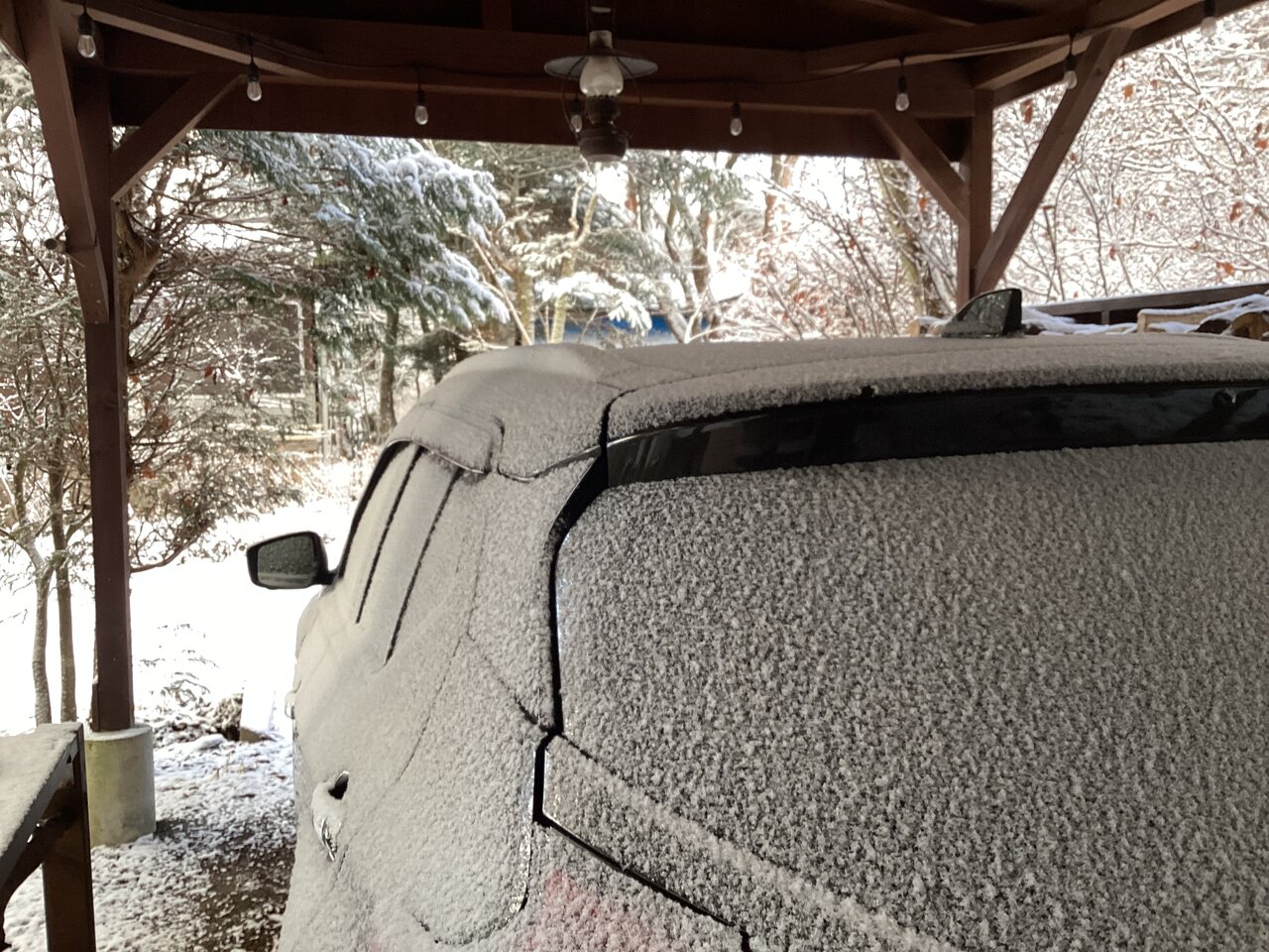 駐車場に屋根があってもこんなに雪が吹き込んできたのは昨晩風が強かったから。この程度の雪なら大したことないが、軽井沢では駐車場に屋根がないと大雪の時難儀する。