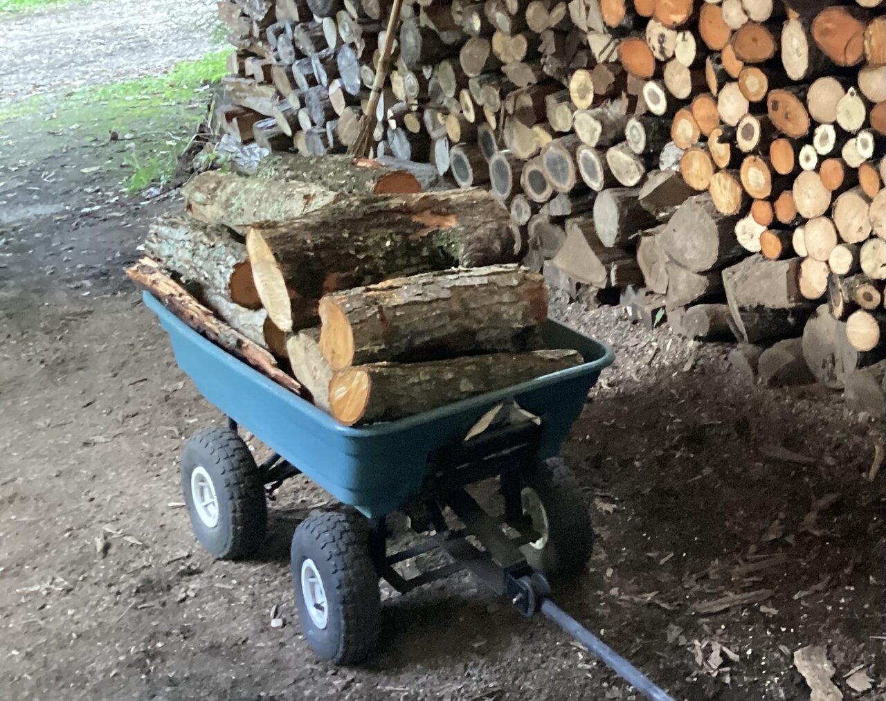 ぽんきち愛用のダンプカート。主に薪の運搬に使用して重宝している。しかしある時タイヤの1本がパンクした。一冬野外に置いておくとどのタイヤも空気が若干抜けるので翌年に使う時に空気を入れるのだが、何度入れても空気が抜ける。パンクだ。