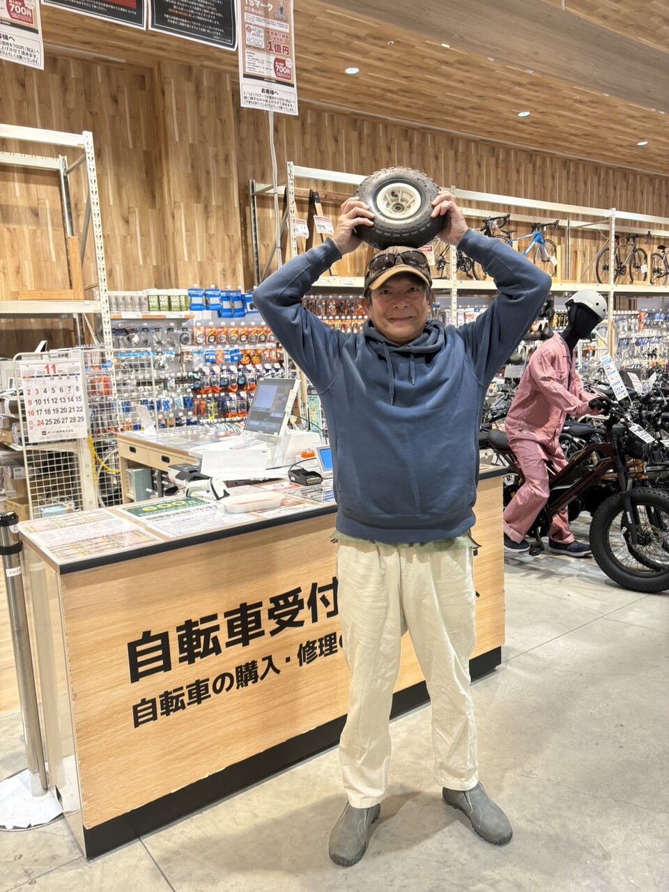 群馬・駒寄のジョイ本ならあるだろうとついでの時に寄ってみた。流石のジョイ本にも同形のものはなかった。仕方ないなぁ、カートそのものを買うか。しかし安いものでも1万円はするし、、、。タイヤが一本パンクしたから買い替えるのも勿体無い。でもタイヤ3本では使い物にならない。パンク? そうだ自転車屋さんに持って行けば良いのでは? と、ジョイ本の自転車屋さんでパンク修理を頼んでみると快く預かってくれた。やった!直った! 修理代1200円。ところが家に帰るとそのタイヤは再びフラットに。修理が不完全だったか、、恐らく穴が複数空いていて別のところから空気が漏れたのだろう。さて、どうしたものか。また修理をお願いするか、、、。