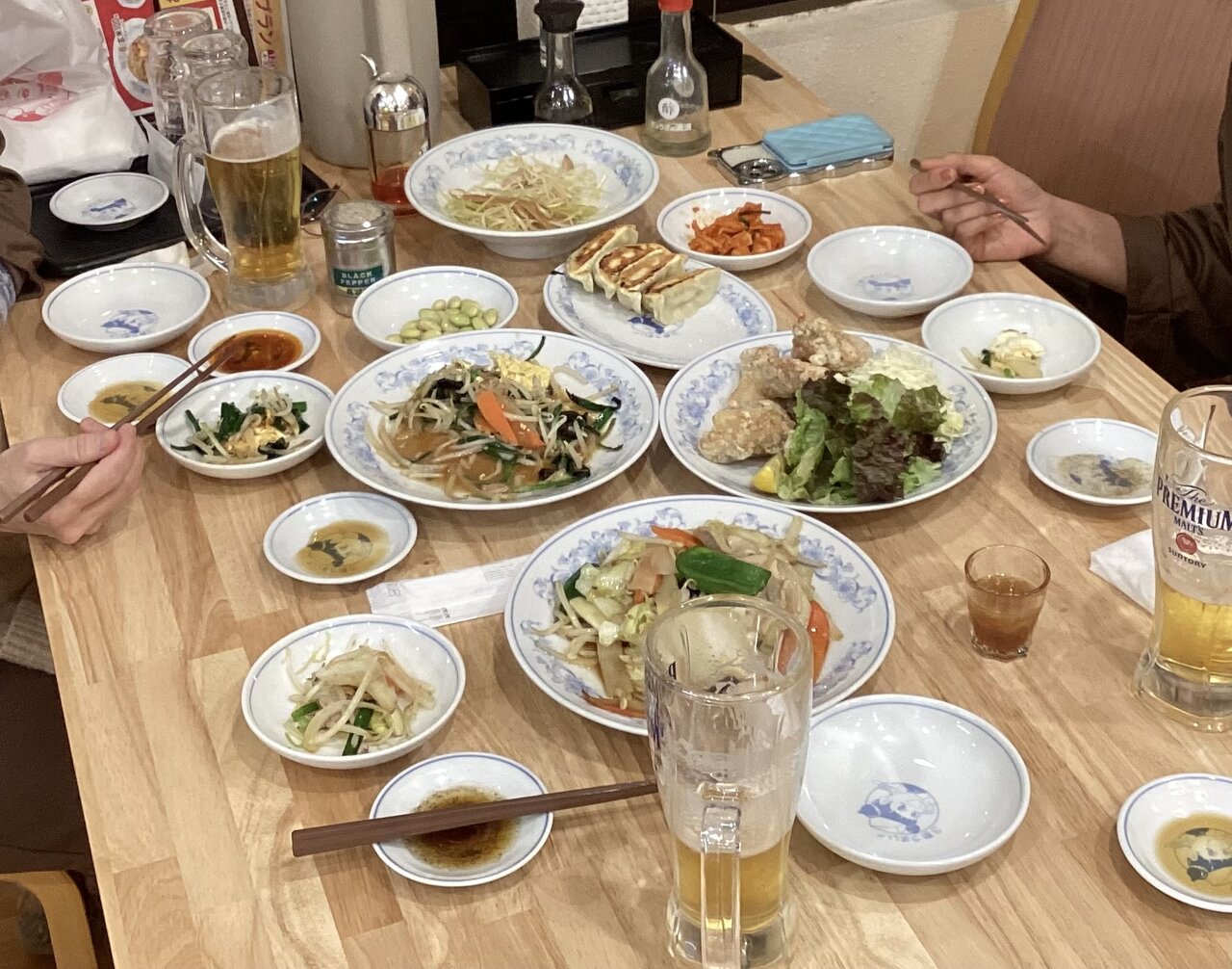 気がついたら夕食はこんなに注文。ビールのあと紹興酒まで飲んで3人で約6000円。
