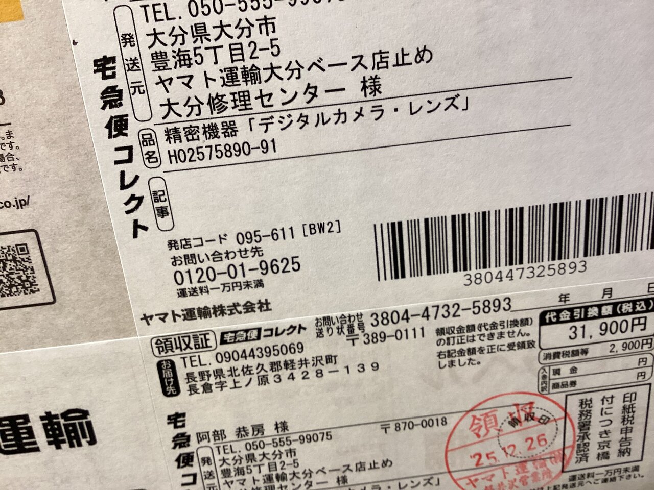 1週間ほどでメールで修理状況と修理代が届いた。結局カメラユニットをそっくり交換。センサーの洗浄もしてくれた。修理代は予定通り¥31,900(税金、送料、代引き手数料込)