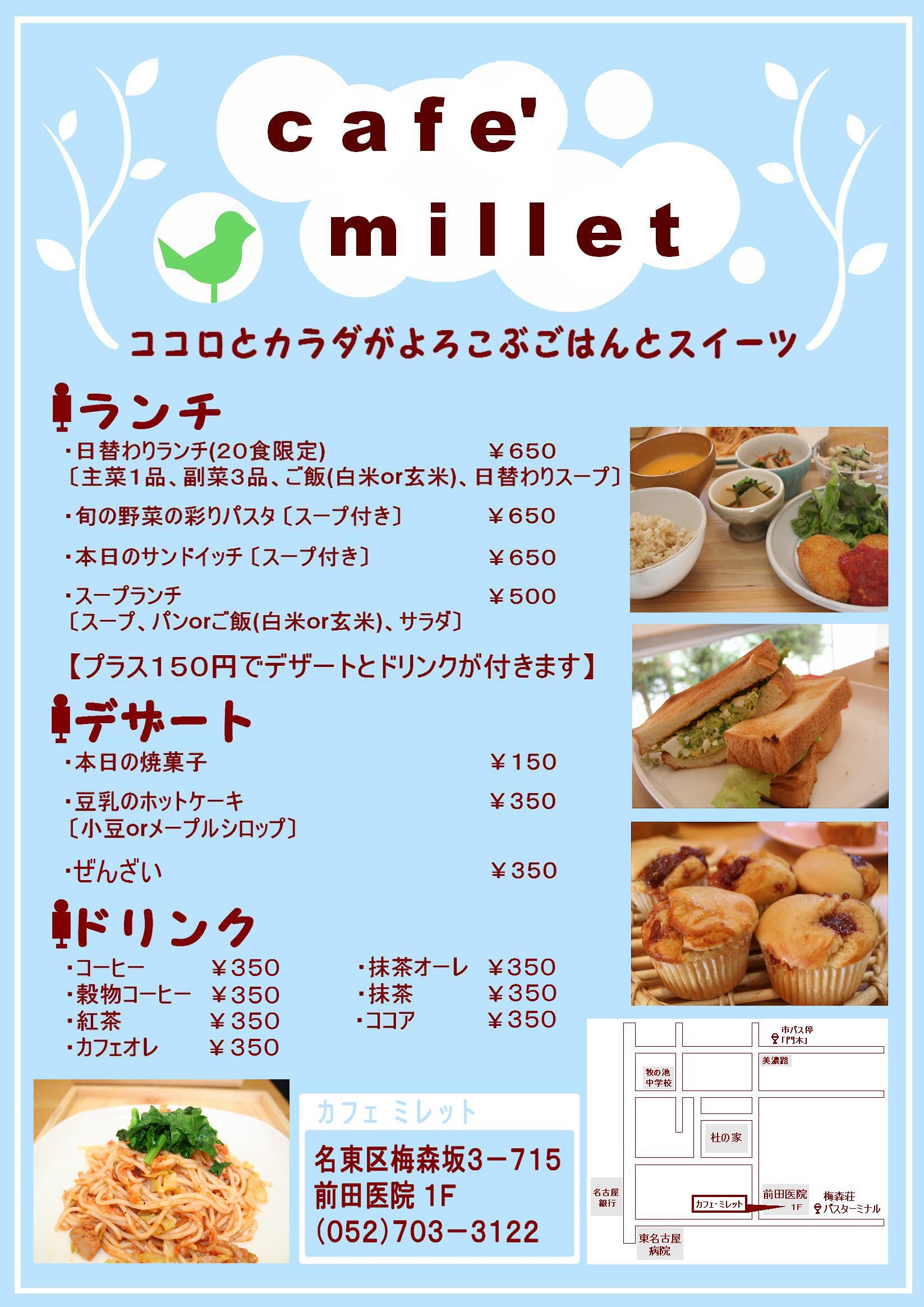2010年04月12日 カフェ ミレット開店です! 4月12日 8時30分 カフェ ミレットが開店しました。 コンセプトは「体にやさしいお料理」です。名東区梅森坂 前田医院さんの横にある、小さなお店ですので、ぜひご来店下さい。 管理栄養士と調理師が皆様をお待ちしております。