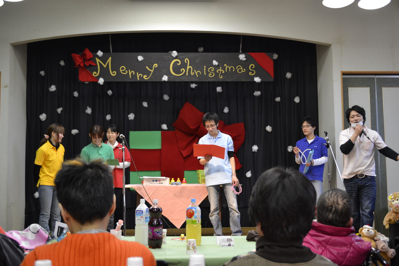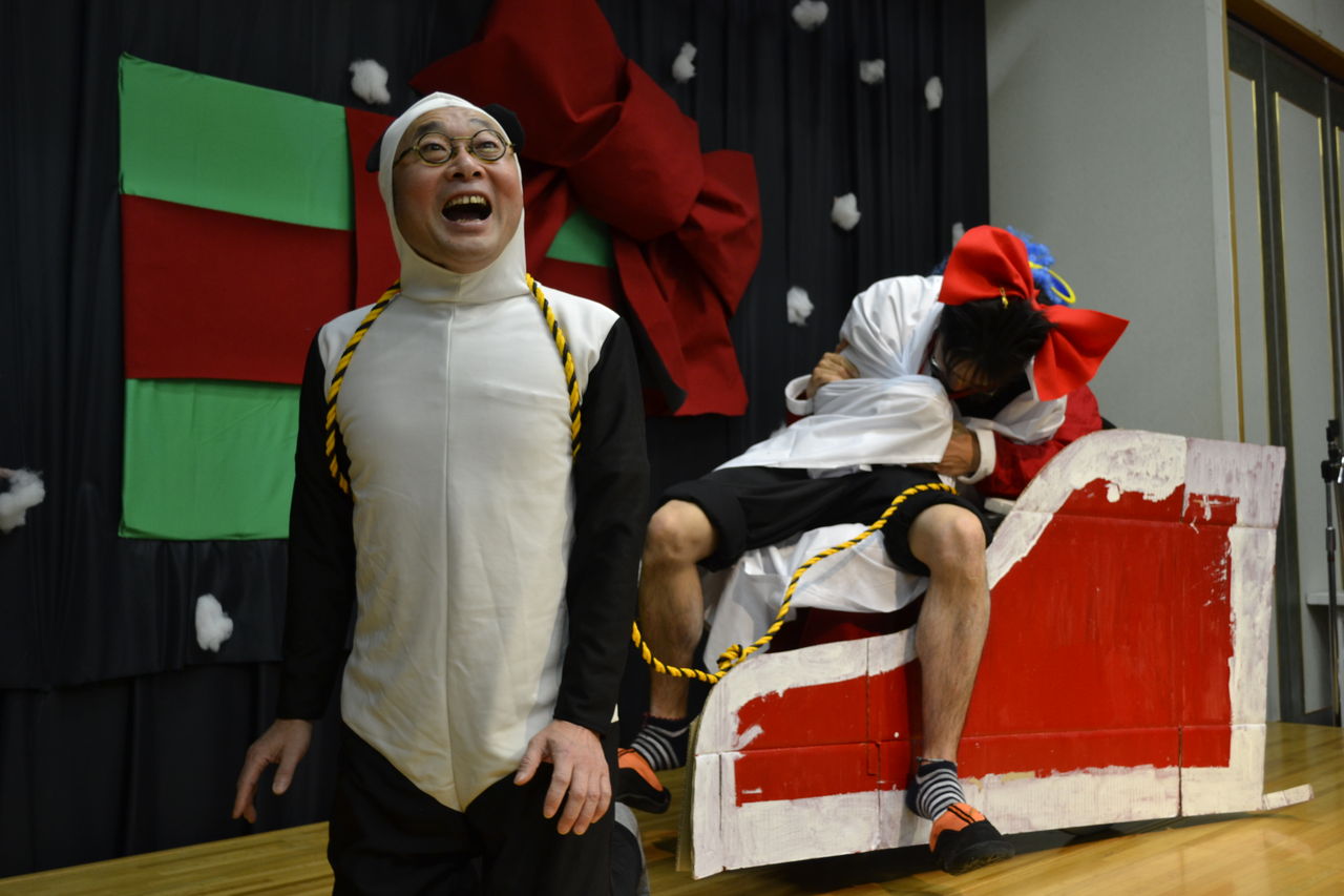 2011年12月26日 クリスマス会2011 MERRY CHRISTMAS!今年のクリスマス会は新人グループからベテランまでの5グループがそれぞれにアイディアを出し合いました。なんとっ 理事長に無理を言って急遽参戦頂きました!初々しさの残る音楽隊パンダに扮し見事に演じきった超ベテランすね毛の処理まで施しそのクオリティをとことん追求ベタな演出の中に斬新さを感じさせた皆さんのもとへはサンタクロースがやってきましたか?