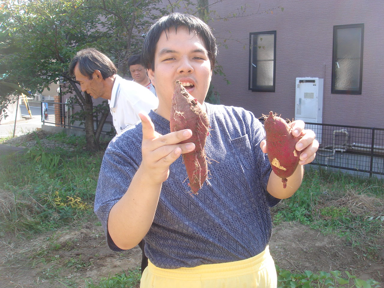 2012年11月02日 コスモスと芋掘り ~アトリエの庭日誌 すっかりと寒くなり冬はすぐそこですね・・・アトリエひまわりでは秋にコスモスが咲き誇りました。そして畑にはたくさんのさつまいもが育ち、ひまわりの利用者さんもいも掘りを行いました!土を触ったり、自然と触れ合うことはとっても楽しいですね。みなさん真剣です。とったど~~~