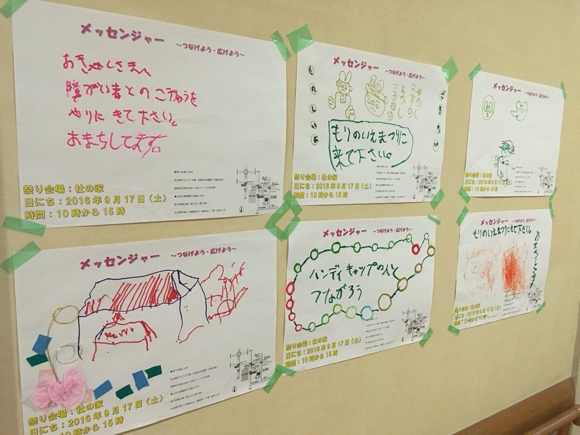 施設内の壁には、ポスターデザインとして利用者さんたちから募集した絵や言葉が掲示してあったり…