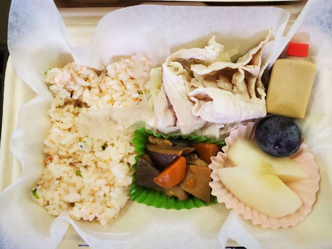 お弁当のメニューは、鮭とみつばのまぜごはん、冷しゃぶ、筑前煮、季節のフルーツ