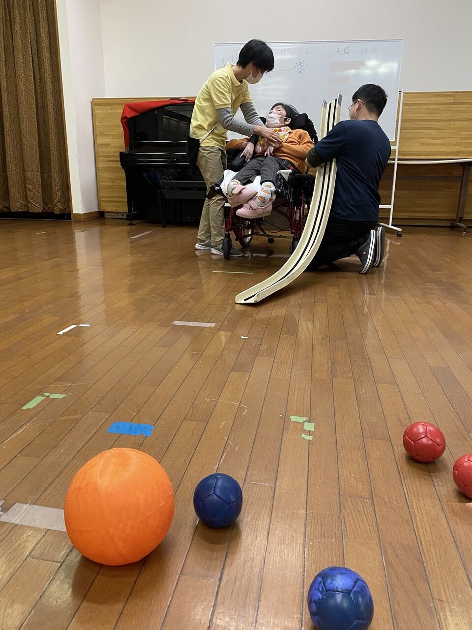 ジャックボール(目標球)と呼ばれる白いボールに、赤・青のそれぞれ6球ずつのカラーボールを投げたり、転がしたり、他のボールに当てたりして、いかに近づけるかを競います。障害によりボールを投げることができなくても、勾配具(ランプ)を使い参加することができます。