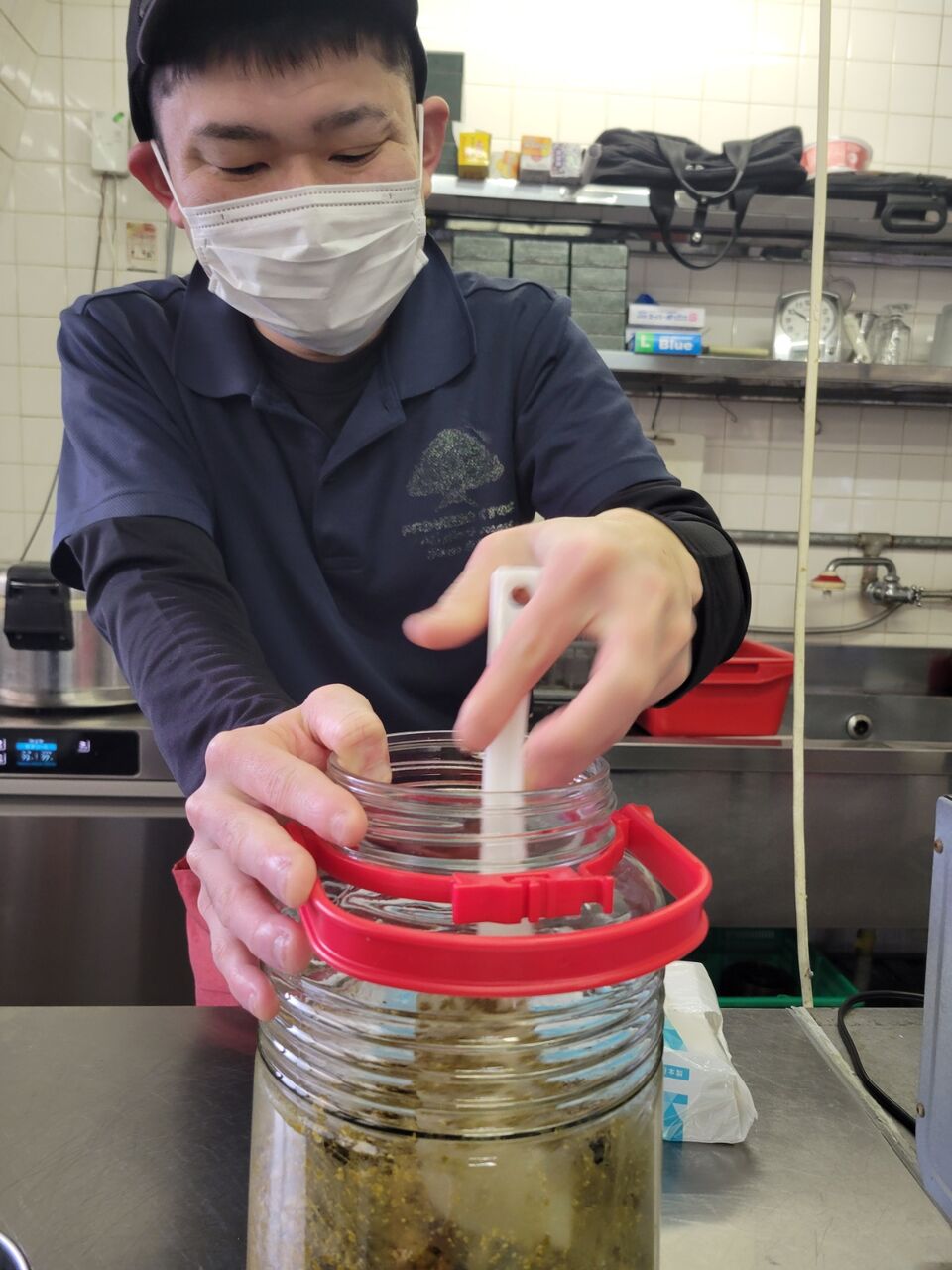 2026年02月19日 「おしょうゆ」になる!? 12/9のお醤油大作戦で材料の合わせなどを行ったあとは、麹室での管理などをお願いしておりました。1週間後にお迎えに行き、12/17くすの木にいらっしゃいました。水を加え、これからもろみの手入れを続けます。1ヶ月目は週2回、それ以降は週1回程度の天地返しを繰り返し熟成を待ちます。毎日の変化を楽しみながら、出来上がりを待ちます。#ひまわり福祉会くすの木 #醤油づくり大作戦 #手前醤油 ♯天地返し 「くすの木」カテゴリの最新記事