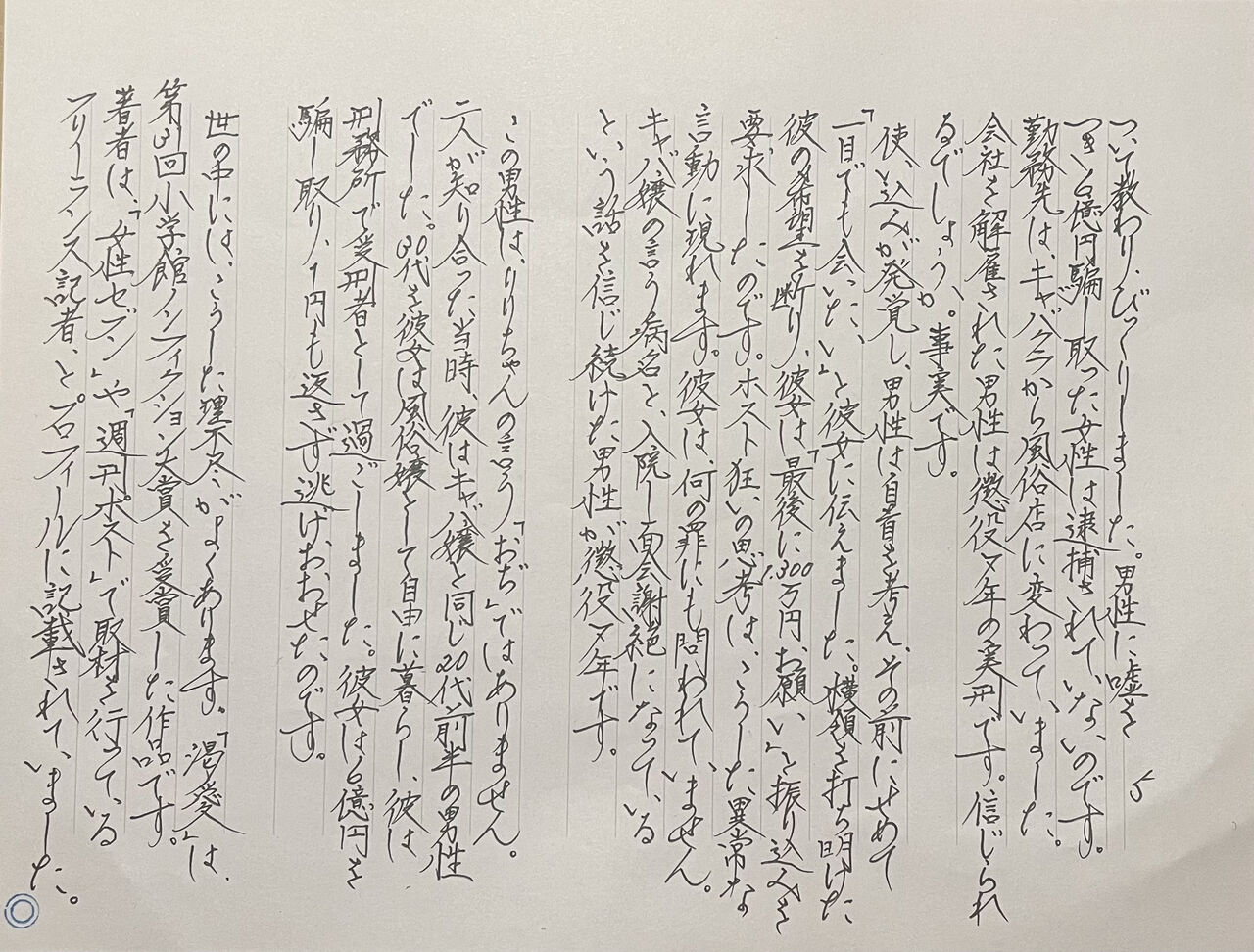 石井によると山田さんは私と出会ってから「ほんの数日の間にほぼ全財産とも言える450万円を奪われた」そうです。連載第2回で「全財産にも等しい450万円」、第20回では「ほぼ全財産とも言える450万円(その後弁護士を通じて100万円だけが戻ってきた)」と書かれました。